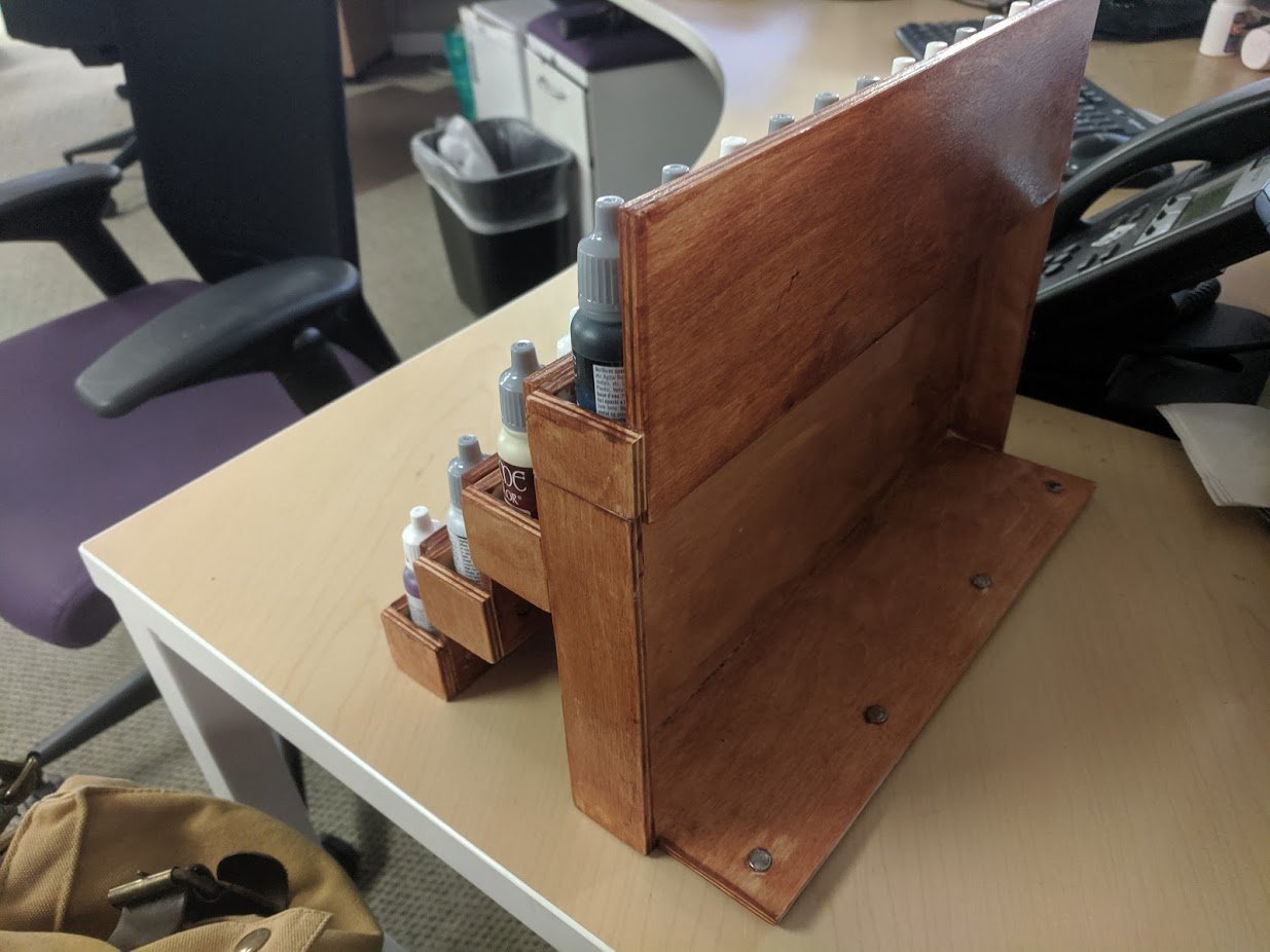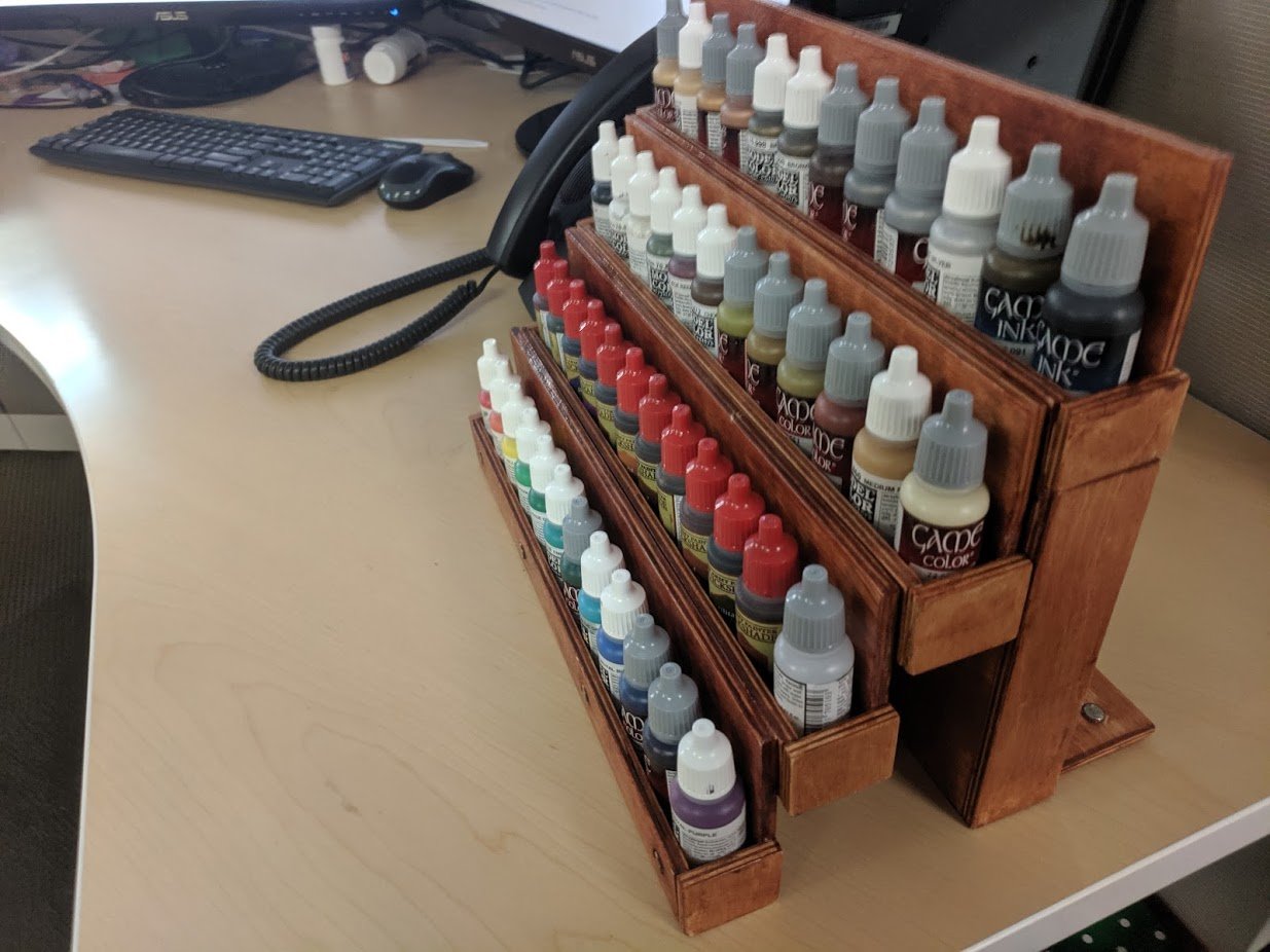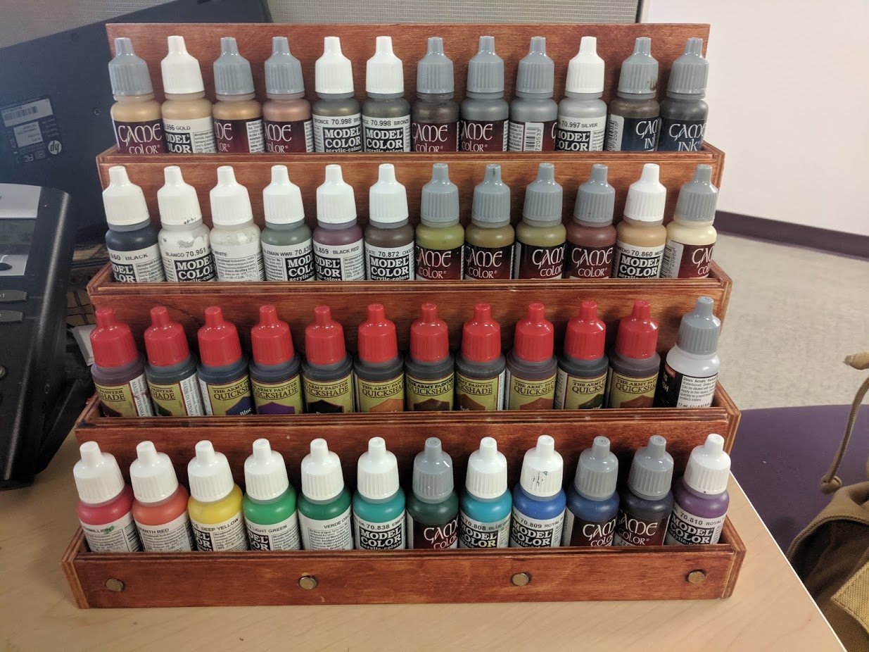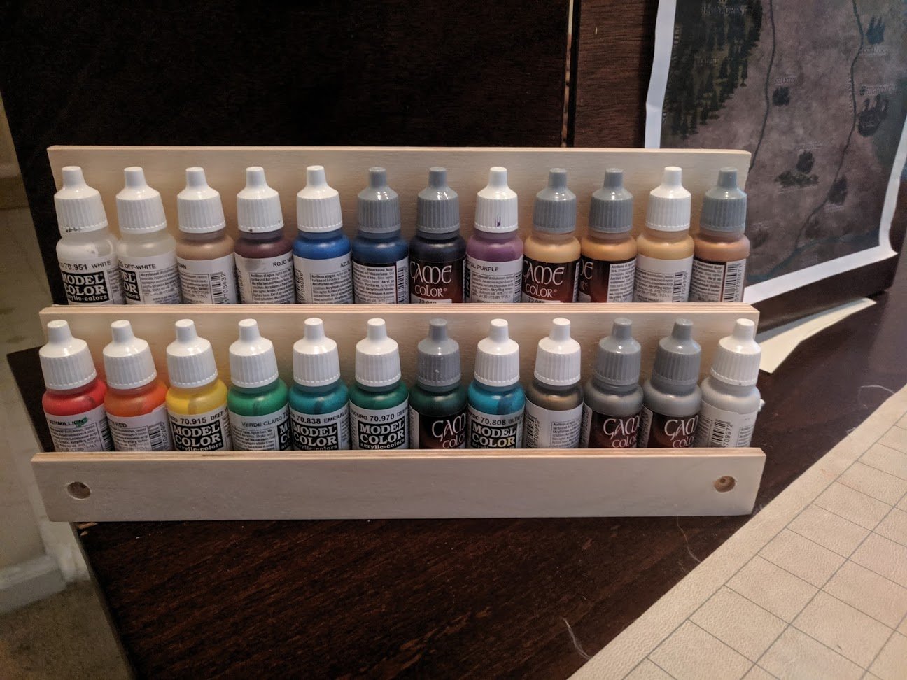 This is my stowaway painting stand for Reaper/Vallejo/Army Painter-size dropper bottles.