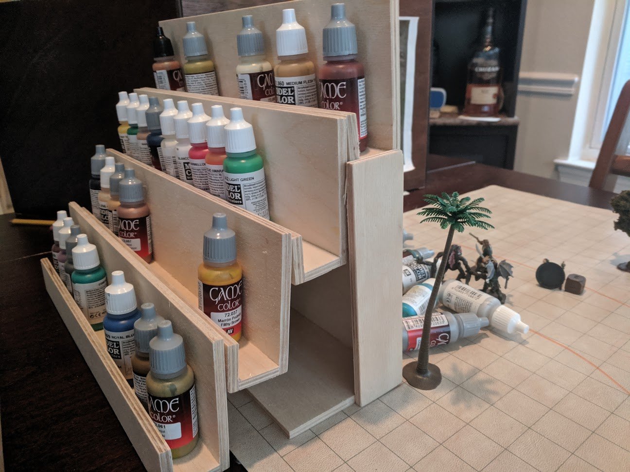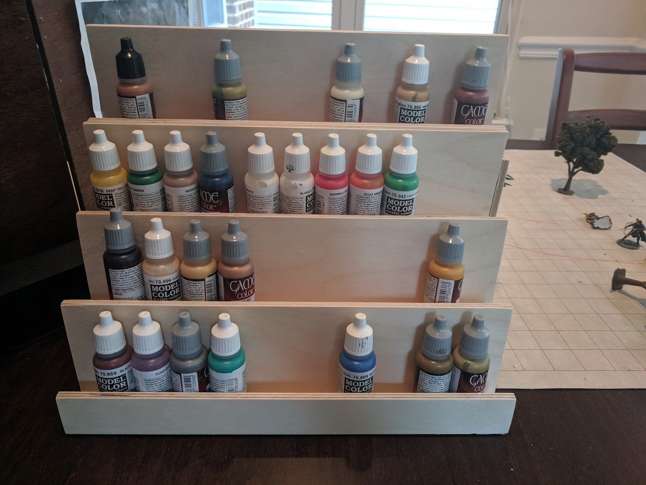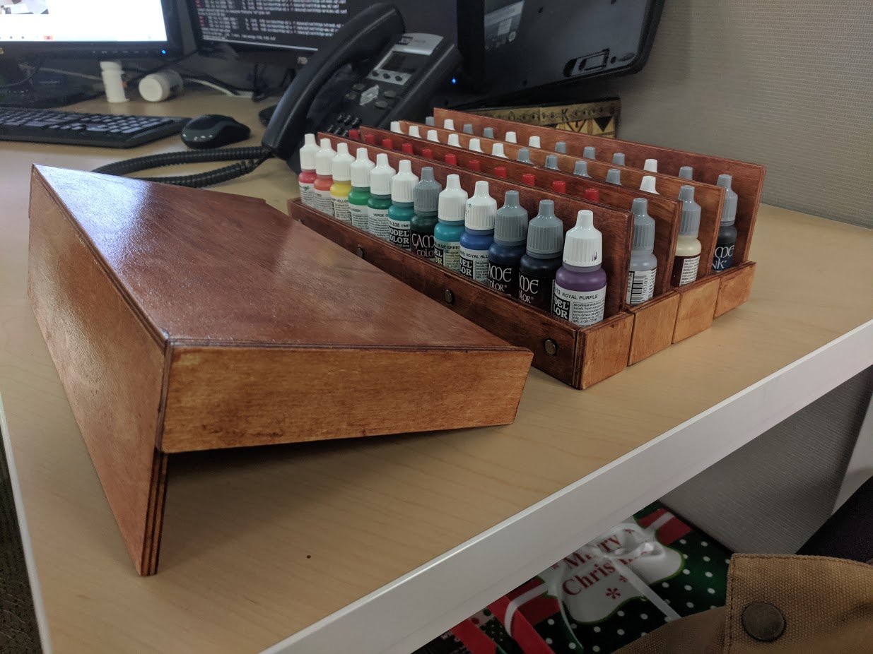 This is my stowaway painting stand for Reaper/Vallejo/Army Painter-size dropper bottles.