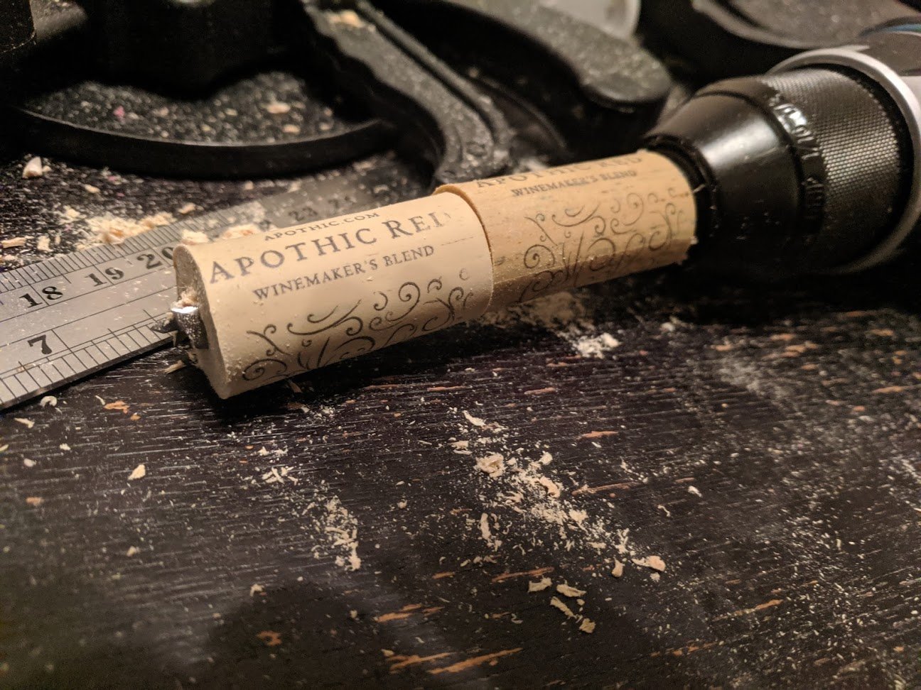 Rig up a depth guide for your drill, with an 11/32" brad-point drill bit (a brad-point is ideal for drilling the insets we need with fairly flat bottoms, and easily centered on a small point).