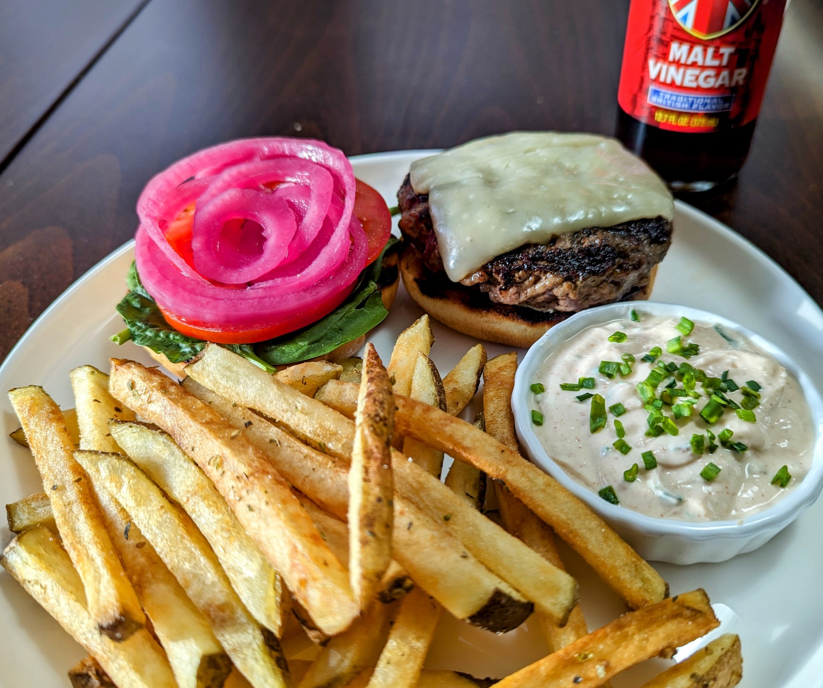 Mix ingredients. Press into patties--roll the edges against the counter to combat the tendency for burgers to ball up on the grill. Grill.