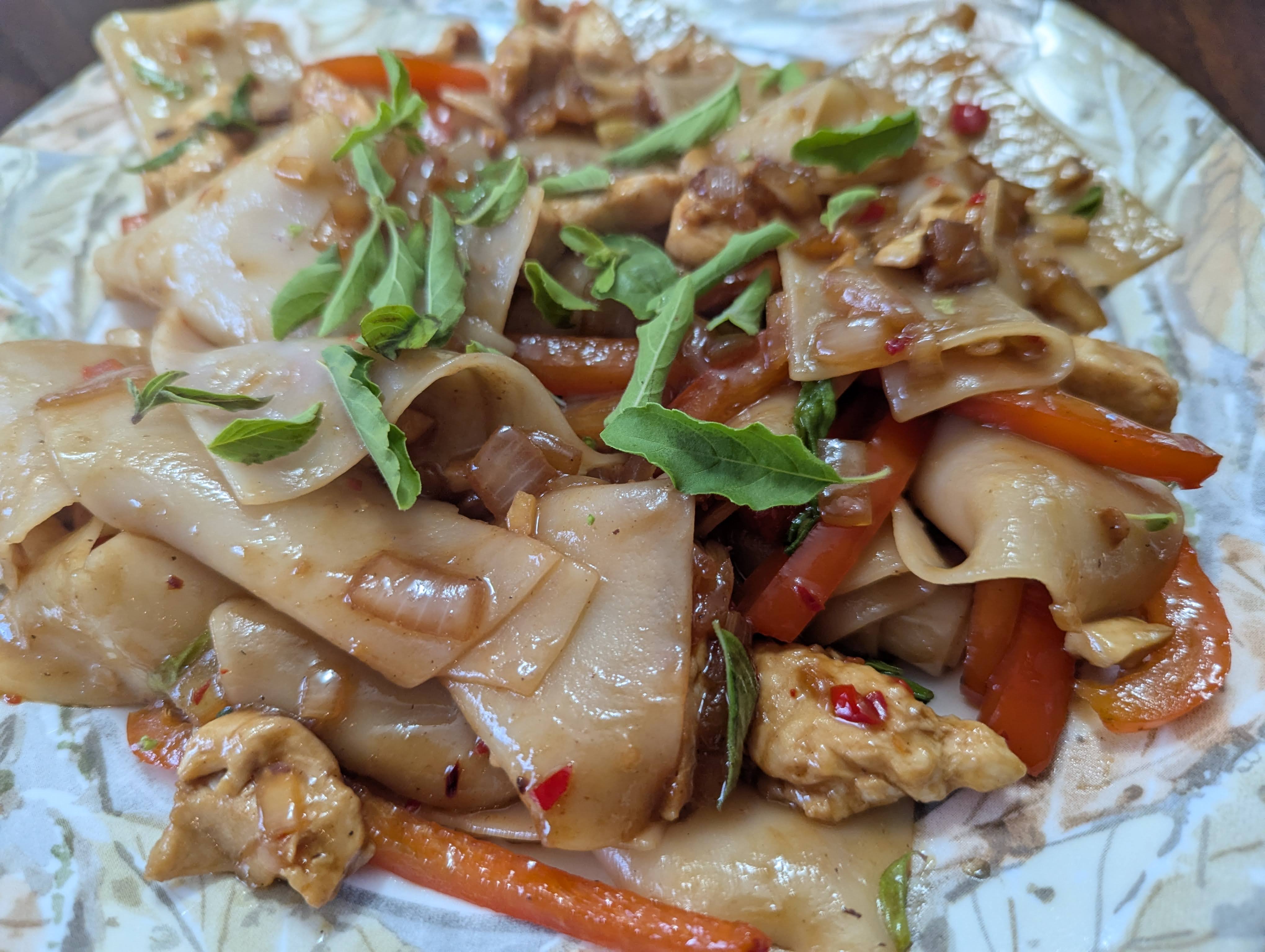 Add peppers and noodles and remaining liquid. Toss together until noodles are fully cooked. Mix in basil and smashed chilis, toss until thoroughly mixed, and serve.