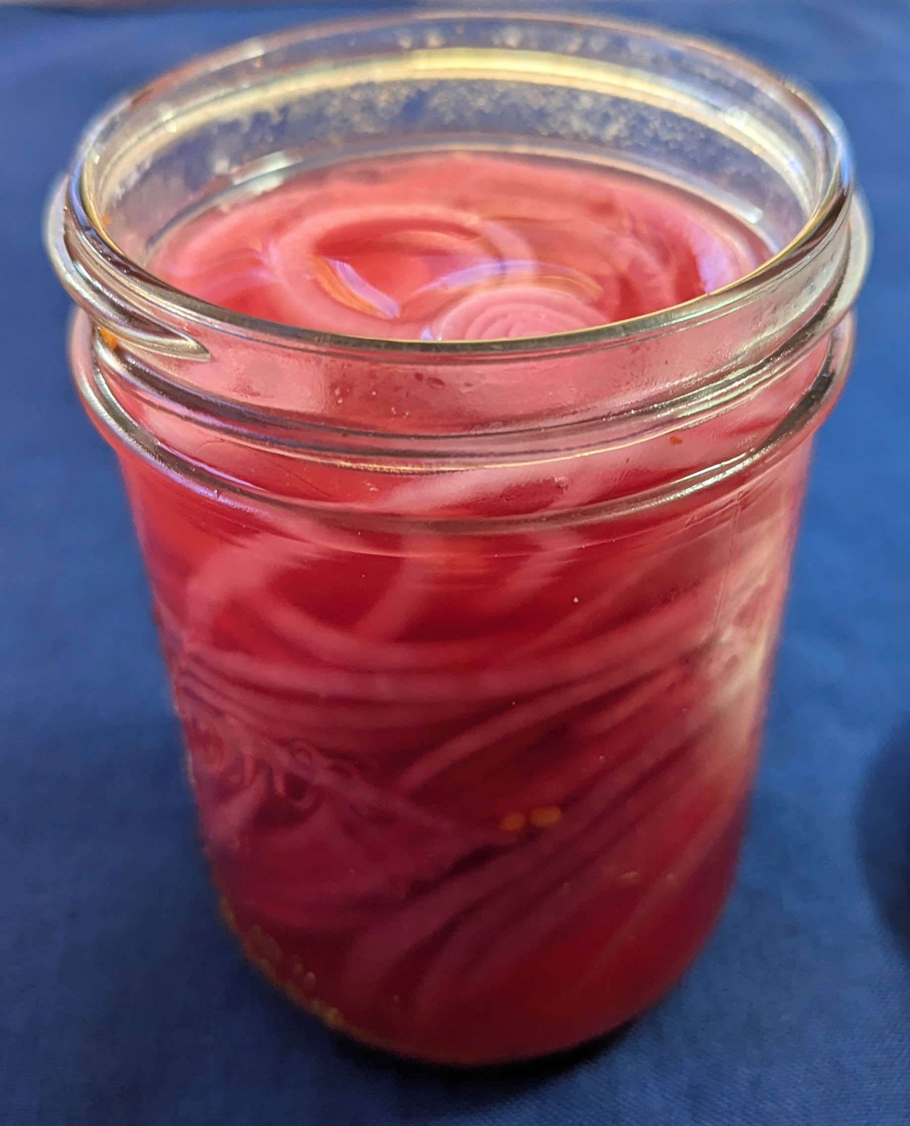 Place sliced onions in jar. Bring all other ingredients to a simmer, and pour into jar. Allow to cool 20–30 minutes, then cover and refrigerate until needed. Last a few weeks in the fridge.